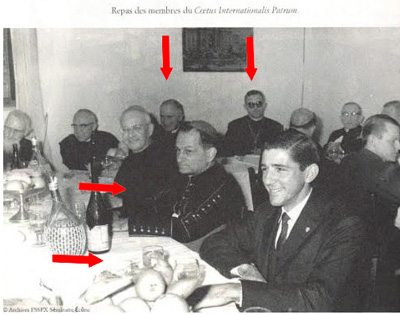 Coetus Internationalis Patrum étkezése a Zsnat alatt- piros nyíl, balról jobbra: Carlos Alberto Soares Corrêa ügyvéd, Antonio de Castro Mayer püspök, Marcel Lefèbvre érsek és Geraldo Proença Sigaud érsek